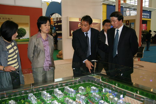 图为董事长包广林向常务副市长张京霞(左三)汇报花样年华的建设情况