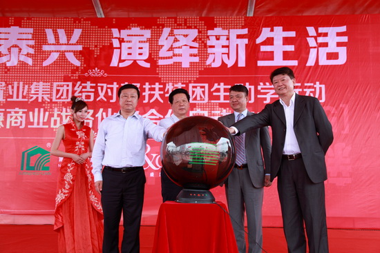 扬州市、泰兴市、邗江区的领导共同登台,启动新世界广场财富之门的水晶球。