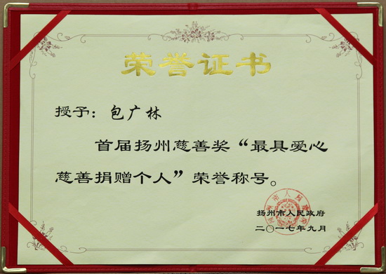 晚会上颁发了首届扬州慈善奖;,设有最具爱心慈善捐赠组织奖、最具感召力慈善工作者奖、最具爱心慈善捐赠个人奖、最具爱心慈善行为楷模奖、最具影响力慈善项目奖,对那些为公益慈善事业作出突出贡献和影响的个人、组织和项目予以表彰。江苏开云网页版页面登录置业集团有限公司董事长包广林荣获最具爱心慈善捐赠个人奖。