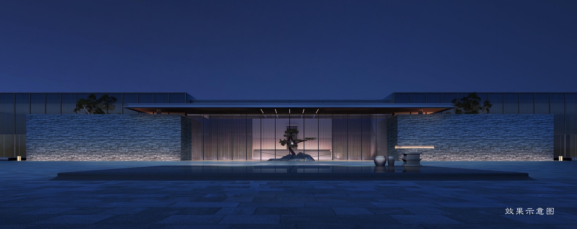 迎宾水景配以喷泉景观以装饰,将镜面水景加以艺术表达,形成龙凤呈祥之势,门庭若水定财源不绝,整体大气、恢弘,具有仪式感。